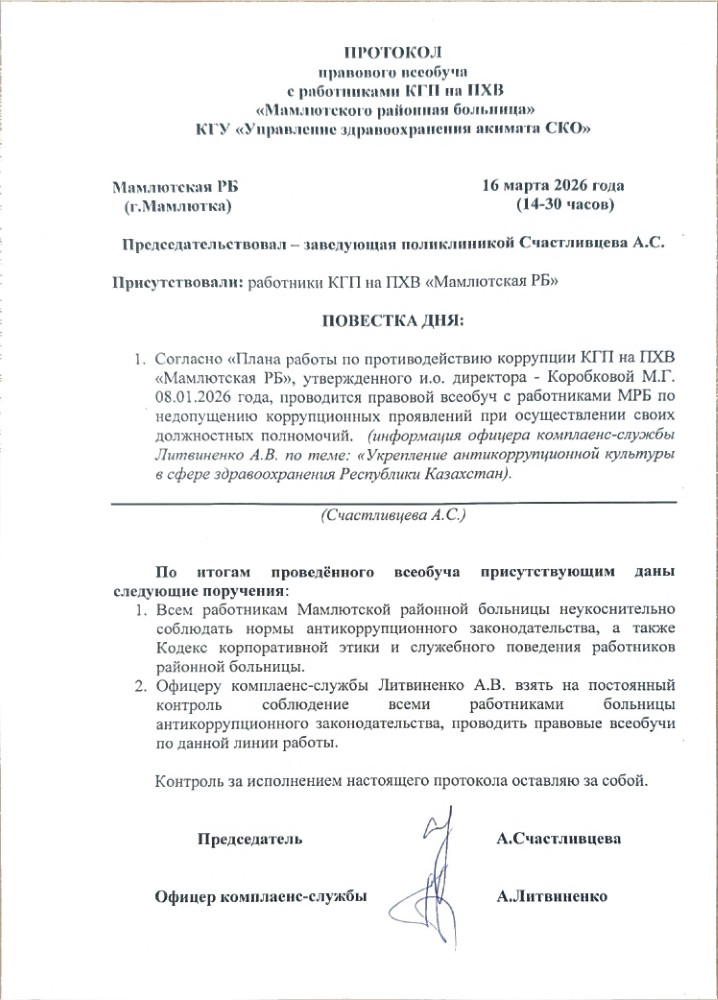 2026 жылғы 16 наурызда «Мамлют аудандық ауруханасы» ШЖҚ КМК емхана меңгерушісі А.С.Счастливцева комплаенс-қызмет офицері А.В. Литвиненко төрағалығымен аурухана қызметкерлерімен «Қазақстан Республикасының Денсаулық сақтау саласындағы сыбайлас жемқорлыққа қарсы мәдениетін тағайындау» тақырыбында жалпыға бірдей құқықтық оқыту өткізілді.